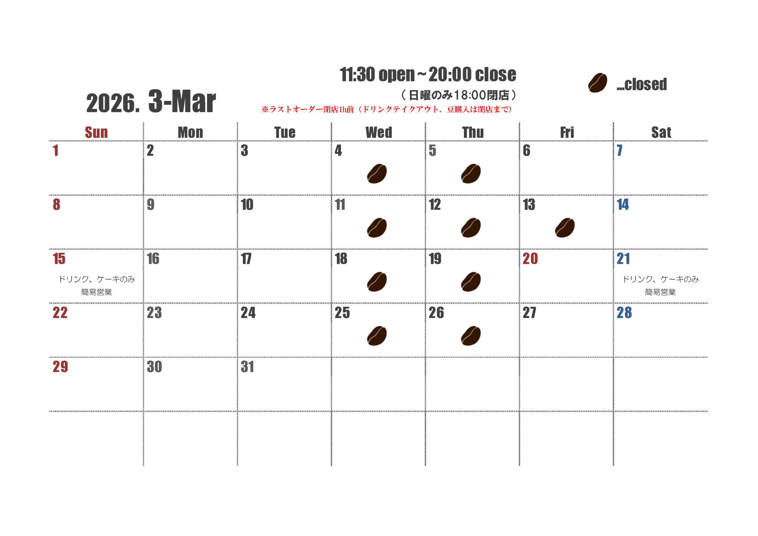 諸事情により3/15(日)、21(土)の二日間はドリンク類とケーキのご提供のみの簡易営業とさせていただきます。