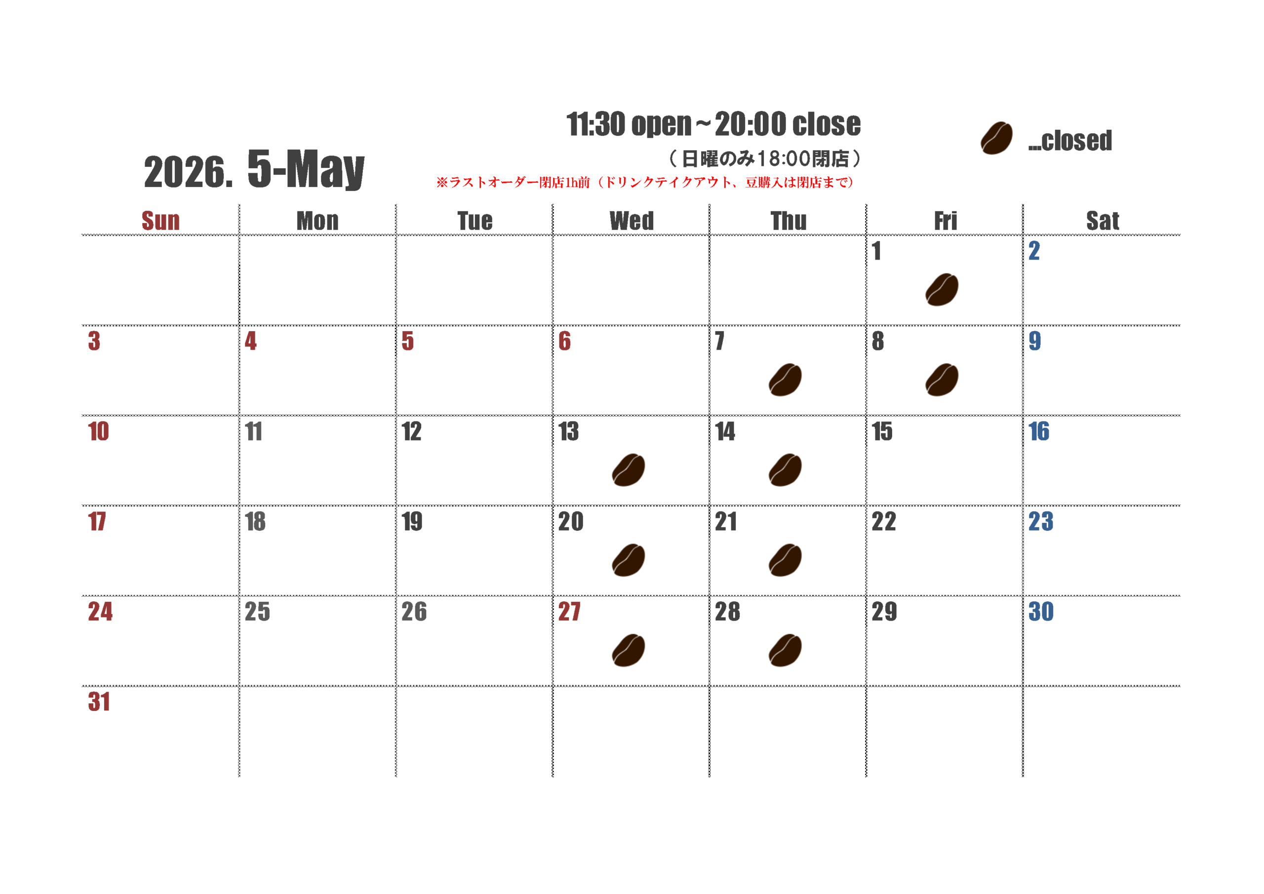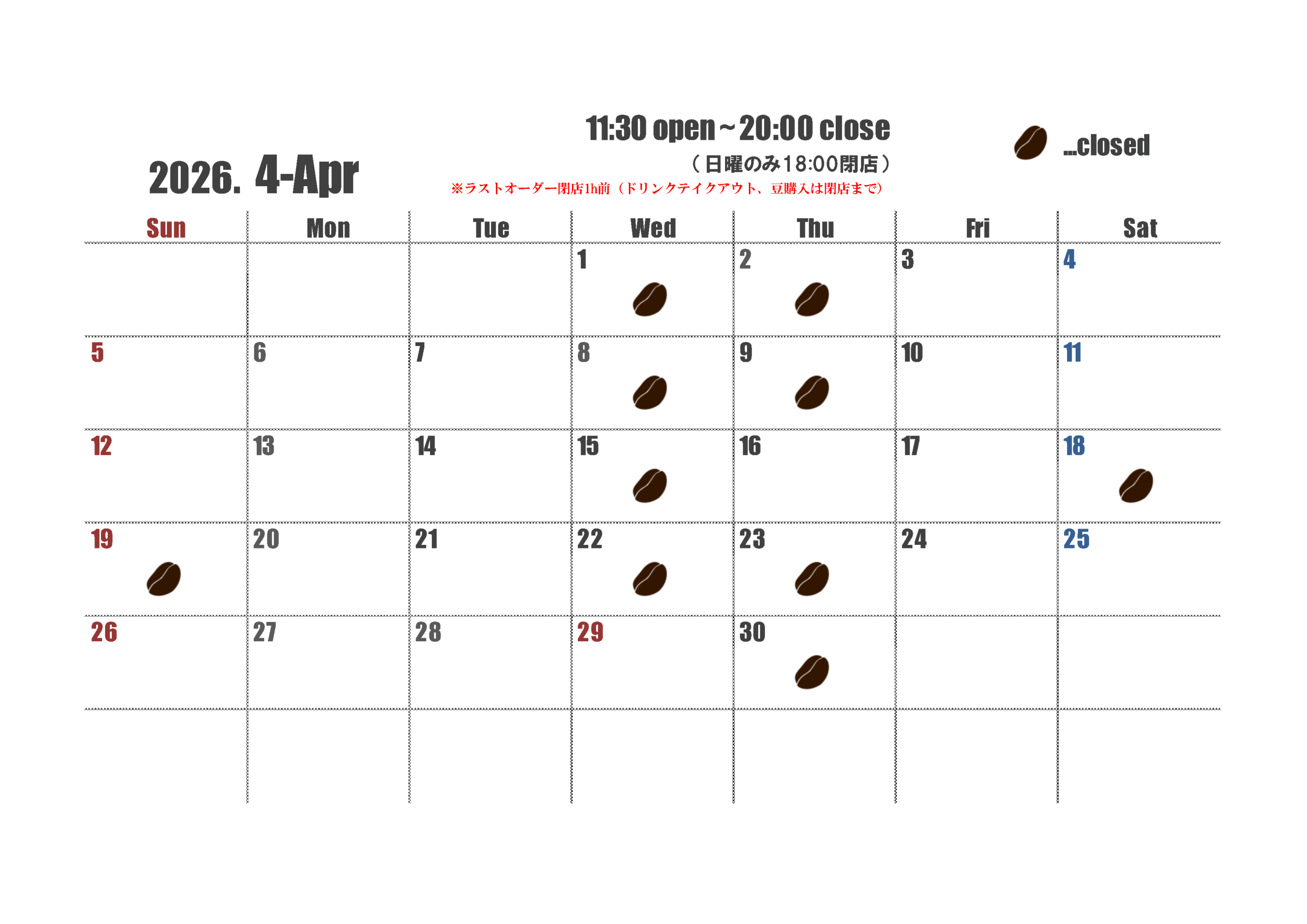 4月は18日(土)、19日(日)は諸事情によりお休みさせていただきます。